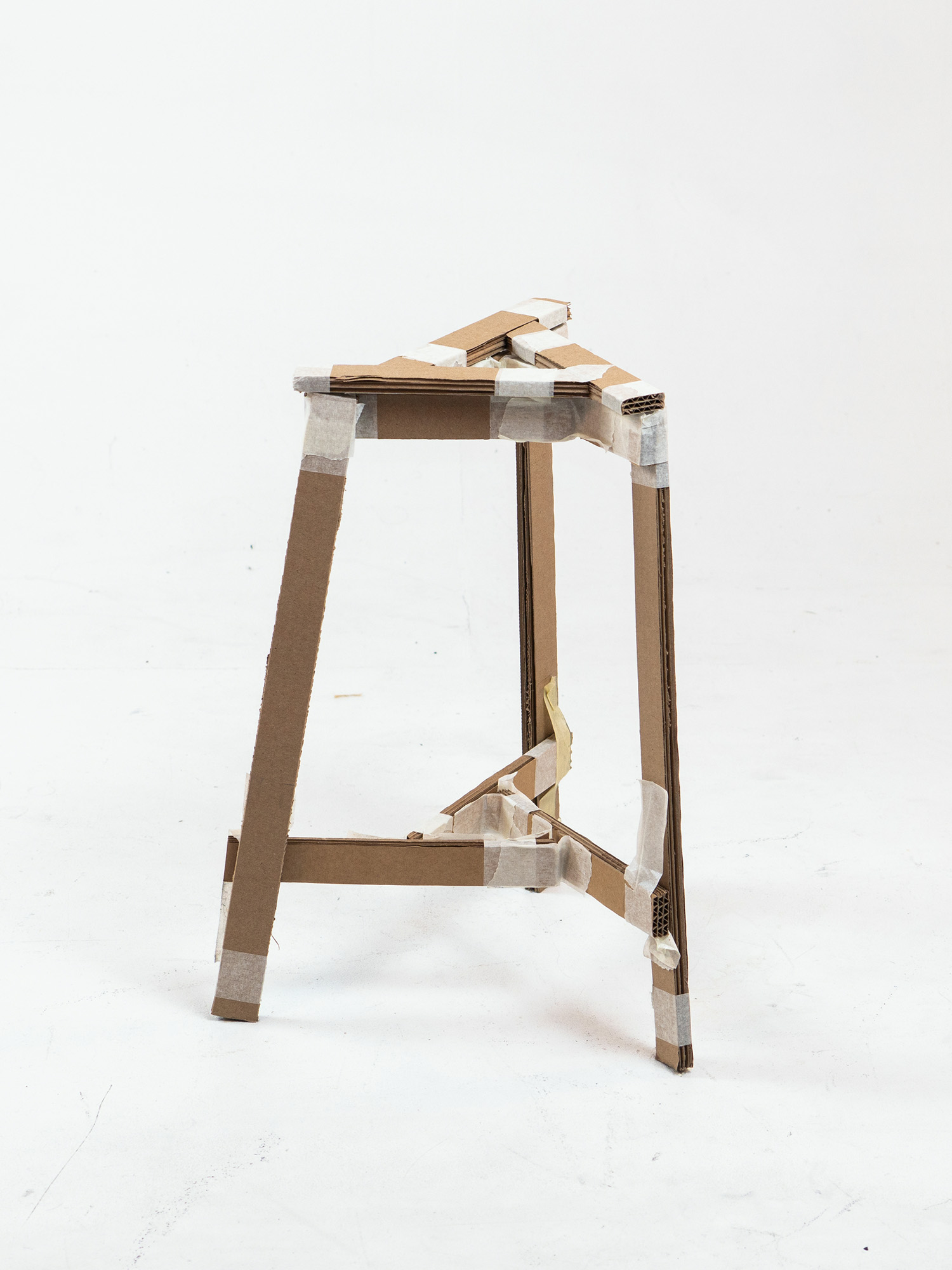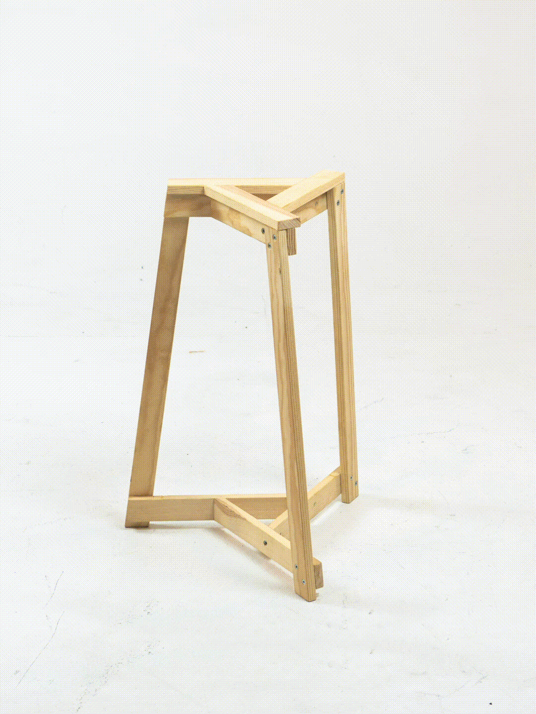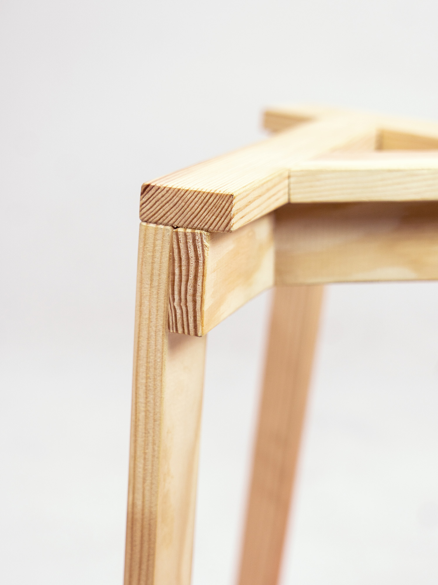 Brief: “Using only 24 screws, no glue and maximum 6 meters of 12x35mm pine, create a stool by tomorrow. It should explore simple techniques (only cutting and screwing), *sustainability and constrained material.”
